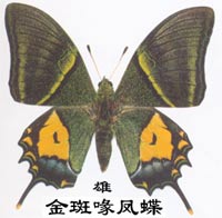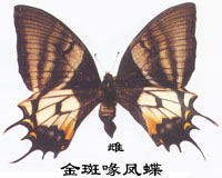 ¡¡¡¡ Á¥Êô·ïµû¿Æ¡£³áÕ¹8.1ÀåÃ××óÓÒ¡£Òòºó³áÓÐÒ»¿é½ð»ÆÉ«´ó°ß¹ÊÃû¡£´ÆÐÛÒìÐÍ¡£ÐÛµû³áÃæ´äÂÌÉ«¡£Ç°³áÍâÔµÓÐ2ÌõºÚ´ø£¬Ç°ÔµÖÁºóÔµ½üºó½Ç´¦ÓÐ1Ìõ»ÆÂÌÉ«µÄб´ø¡£ºó³áÖÐÓòÓÐ1´óÐͽð»ÆÉ«°ß£¬ÍâÔµÓÐ1¸ùϸ³¤µÄβͻ¡£´Æµûǰ³áµºÚÉ«£¬ÍâÔµ´øºÚÉ«£¬ÑÇÍâÔµÓÐ1ÌõÂÌÉ«µÄϸ´ø£¬´ÓǰԵ¾ÖÐÊÒÖв¿µ½ºóÔµÓÐ1Ìõ°×ɫбºá´ø¡£ºó³áÖÐÓòΪ´óÐÍÈé°×É«°ß£¬ÍâÔµÓÐ2¸ù³¤Î²Í»¡£ ¡¡¡¡½ð°ß๷ïµûÊÇÎÒ¹úÌØÓеÄÊÀ½çÃû¹óÕäµû£¬Éú»îÔÚ1000Ã×ÒÔÉϵÄÀ«Ò¶¡¢ÕëÒ¶³£ÂÌÁÖ´ø¡£Ò»Äê·¢Éú1´ú£¬Ô½¶¬´ú³É³æ¶àÔÚ3Ôµ×4Ô¼ä»î¶¯£¬ÉÙÊý¿ÉÑÓÐøµ½8Ô·ݡ£·Ö²¼Óڹ㶫¡¢¹ãÎ÷¡¢º£ÄÏ¡¢½Î÷¡¢Õ㽡¢ºþÄÏ¡¢¸£½¨µÈµØ¡£  ¡¡¡¡1988ÄêIUCN£¨¹ú¼Ê×ÔÈ»Óë×ÔÈ»×ÊÔ´±£»¤ÁªÃË£©Öƶ¨µÄÊÜÍþвÎïÖÖºìÆ¤Ä¿Â¼ÖÐÁÐΪK¼¶±£»¤¶ÔÏó¡£1989ÄêÎÒ¹ú¹«²¼µÄ¡°¹ú¼ÒÒ°Éú¶¯ÎïÖØµã±£»¤Ãû¼¡±²Ý°¸Öн«½ð°ß๷ïµû£¨Teinopalpus aureus£©ÁÐΪһ¼¶±£»¤¶ÔÏó¡£±¾ÖÖÕäÏ¡µÄÔÒòÒ²ÐíÓУº1¡¢·Ö²¼µØÇøÏÁÕ£¬½öÏÞÓÚ¶«ÑóÇøµÄ¾Ö²¿µØÇø£»2¡¢ÑôÊ¢ÒõË¥£¬´Æ¡¢ÐÛÐÔ±ÈÏà²îÐüÊ⣨1: 50¡«200£©£»3¡¢ÒòΪÕäÏ¡£¬ËùÒÔºûµûÑо¿Õß¡¢ÊղؼҼ°°®ºÃÕß¶¼¾ºÏàÁÔÈ¡£¬ÉõÖÁÓÐÈ˲»Ï§ÖؽðÊÕ¹º£¬Ä±ÀûÕßÔò¿ñ²¶ÀIJɣ¬Ò²ÊÇÔì³ÉÏ¡ÉÙµÄÔÒòÖ®Ò»¡£