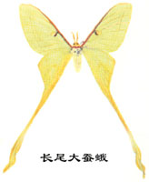 翅展90一110毫米。体白色,触角黄褐色,前胸前缘紫红色,肩板后缘淡黄色;前翅粉绿色,外缘黄色;中室有1个眼纹,中央粉红色,内侧有较宽的波形黑纹,间杂有白色鳞毛,外侧黄色有黄褐色轮廓;外线黄褐不明显。后翅后角的尾突延长成飘带状,长达85毫米;尾突橙红色,近端部黄绿色,外缘黄色,中室眼纹粉红色,不甚明显,外线不显著。一年发生两代,成虫4月及7月间出现,以蛹在附着于枝条上的茧中过冬。