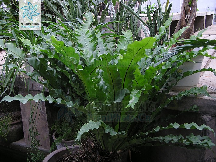 巢蕨是著名观赏蕨类植物,自然界中的巢蕨常附生于树干或岩石 上。 叶片以莲座状螺旋式自内向外生长,全株外形似鸟巢而奇特,具极高的观赏价值。图片为室内悬挂于空中的巢蕨。
