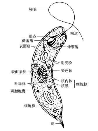 裸藻门植物体无细胞壁,多数为游动型的单细胞体,细胞最外层是原生质体膜,自养型裸藻细胞内有光合色素;异养型裸藻主要行腐生或吞噬性生活,细胞内不含光合色素。裸藻门植物主要以细胞分裂形式繁殖。