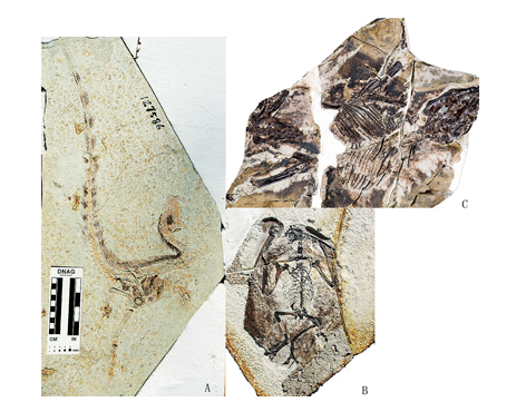 几种有毛或者毛状衍生物的动物:(A)恐龙(中华龙鸟);(B)翼龙(宁城热河翼龙);(C)哺乳动物(玲珑仙兽)