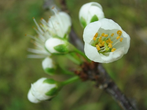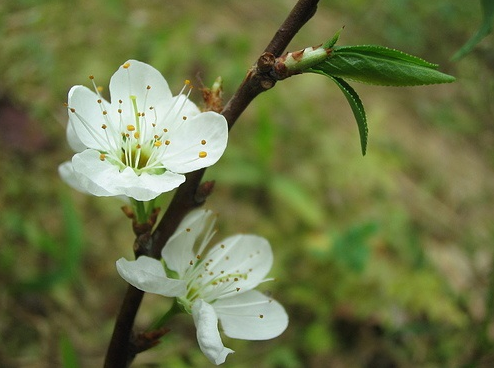 李,花叶同出,两至三朵并生于枝头,花蕊黄色,花梗较长。