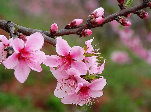 最近热播的《三生三世十里桃花》,除了剧中男女唯美曲折的爱情,最吸引人的莫过于折颜那十里桃林了。因为陶渊明的《桃花源记》,桃林自古就成为理想世界的代表。而原产于中国的桃花更是从古至今文人歌颂的对象,“桃之夭夭,灼灼其华”,淡粉色的花朵,明媚娇艳。那么如何在万花丛中将那朵朵桃花区分开来呢?桃花盛开的时候,一般会长出新叶,呈现花叶同出的状态,另外,桃花一般是单生花,即一朵花单生在小枝上。没有花柄或者花柄极短。
