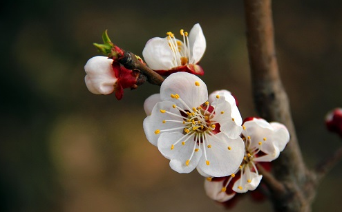 明《广群芳谱》描述杏花:“叶似梅,差大,色微红,圆而有尖?;ǘ驴纯亢?,开时色白,微带红,至落则纯白矣?!毙踊ㄎ纯贝亢?,说的是杏花深红色的花萼。深红褐色的枝条和花萼是杏花的标志,另外,含苞至初开时,花萼直立,花开后花萼常反折。花瓣近圆形,没有花柄,先花后叶。这都是杏花的识别特点。