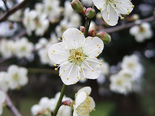 “墙角数枝梅,凌寒独自开”提到梅花,总少不了赞赏它不畏严寒的品性,的确,梅花是这些花中绽放最早的种,从寒冬腊月至来年三月,都少不了梅花疏影横斜的身影。梅花花朵较小,花瓣接近正圆形,没有花柄,先花后叶。与同属的杏花最大的区别是梅花的萼片不会反折,杏花的小枝红褐色,但是梅花小枝绿色。