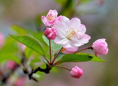 2、西府海棠,《本草纲目》中称之为“海红”,可入药。花瓣也多为粉色,相对于垂丝海棠低垂下的娇羞,西府海棠则以一种仰望天空的姿态傲然绽放。一个如小家碧玉,一个像大家闺秀,你知道怎么区分了吗?