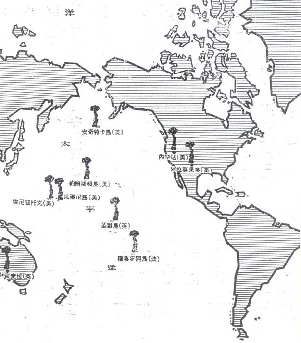 美国从1946年到1958年在马绍尔群岛共进行了60多次原子弹和氢弹的试验爆炸。规模最大的一次试爆是在比基尼岛进行的。在这一段时间里,马绍尔群岛的比基尼等岛上的居民,由于岛上受到严重的放射性污染被迫迁居了。