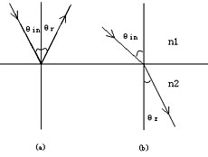光的反射服从反射定理: θ in =θ r,即反射角等于入射角。 光在反射时,改变了传播方向。同样,可以看到,当光以一定的角度从某种介质进入另一种介质时,它的传播方向也会改变,在两种介质的分界面上并不沿直线传播,而是发生了偏折,光的这种偏折现象叫做折射。现实生活中存在大量的折射现象。比如雨后的彩虹,它是由于阳光在不同折射率的大气中发生折射而形成的;又比如装满水玻璃杯中的筷子看上去是弯的。怎样认识光的折射现象呢?这是因为光在不同的介质中的传播速度是不同的,光在空气中的速度近似为光在真空中的速度,光在真空的速度是3×108km/s。但是,光在其它媒质中传播时,速度就变慢了。例如,在水中光速就减至2.25×108km/s。光在介质中的速度由这种介质的折射率决定。不同的介质有不同的折射率,光在折射率小的介质中跑的快,在折射率大的介质中跑得慢。 光的折射服从折射定律:n1sin θin= n2sinθz。 即光线从折射率为n1的介质以入射角θin射到两个介质的分界面,并以θz进入折射率为n2的介质中时满足上述关系。 劳动人民在长期的生产斗争中积累了丰富的实践经验。一位吹玻璃的工人观察到光可以从玻璃棒的一端传到另一端,而棒的四周没有光跑出来,这就是全反射现象。玻璃的折射率大于空气的折射率,合适的光进入玻璃棒后,光就在玻璃棒和空气的交界面上发生全反射,把光关在玻璃棒中,因而玻璃棒的四周看不见光。早期的光纤就是基于这一原理,用单一材料制成的,现在一般的塑料光纤也是利用这一原理传光的。 全反射定理的内容是这样的:光从波疏媒质进入波密媒质,当入射角增大到一定的角度时,折射光就会全部消失。即