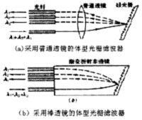 下面分别是基于干涉原理的多层介质膜滤波器原理图和基于光栅原理的体型光栅滤波器示意图。