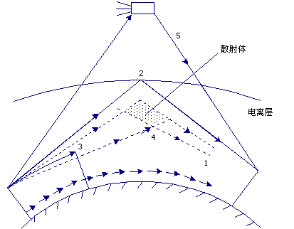 天波传播,就是自发射天线发出的电磁波,在高空被电离层反射回来到达接收点的传播方式。如下图中2所示。电离层对电磁波除了具有反射作用以外,还有吸收能量与引起信号畸变等作用。其作用强弱与电磁波的频率和电离层的变化有关。