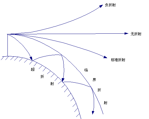 无折射就是大气的折射率不随大气的垂直高度变化而变化。负折射顾名思义就是由于折射率随高度增加而增加,使得电波的传播方向与地球的弯曲的方向相反。正折射的意思当然是恰恰相反。