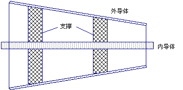 直线式渐变阻抗变换器的结构纵剖面如图所示,在两端不同阻抗的同轴线之间,用外导体的内径直线连续渐变的方式进行阻抗变换。同轴线的特性阻抗与内外导体的几何尺寸有关,即