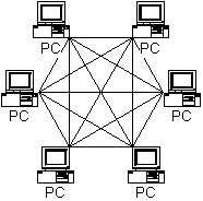 如果一个网络只连接几台设备,最简单的方法是将它们都直接相连在一起,这种连接称为点对点连接。用这种方式形成的网络称为全互连网络,也就是网状网络,如上图所示。图中有6个设备,在全互连情况下,需要15条传输线路。如果要连的设备有n个,所需线路将达到n(n-1)/2个!显而易见,这种方式只有在涉及地理范围不大,设备数很少的条件下才有使用的可能。即使属于这种环境,在LAN技术中也不常使用。这里所以给出这种拓扑结构,是因为当需要通过互连设备(如路由器)互连多个LAN时,将有可能遇到这种广域网(WAN)的互连技术。
