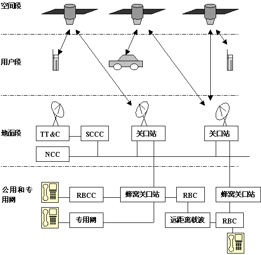 低轨道卫星移动通信系统由卫星星座、关口地球站、系统控制中心、网络控制中心和用户单元等组成。下图示出了低轨道卫星移动系统的基本组成。在若干个轨道平面上布置多颗卫星,由通信链路将多个轨道平面上的卫星联结起来。整个星座如同结构上连成一体的大型平台,在地球表面形成蜂窝状服务小区,服务区内用户至少被一颗卫星覆盖,用户可以随时接入系统。