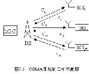 在码分多址(CDMA)蜂窝通信系统中,用户之间的信息传输也是由基站进行转发和控制的。为了实现双工通信,正向传输和反向传输各使用一个频率,即通常所谓的频分双工。无论正向传输或反向传输,除了传输业务信息外,还必须传送相应的控制信息。为了传送不同的信息,需要设置相应的信道。但是,CDMA通信系统既不分频道又不分时隙,无论传送何种信息的信道都靠采用不同的码型来区分。类似的信道属于逻辑信道。这些逻辑信道无论从频域或时域来看都是相互重叠的,或者说它们均占有相同的频段和时间。左图是CDMA通信系统的工作示意图。