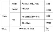 上述方案中以宽带CDMA作为主要的侯选多址技术。在CDMA技术中可分为三类:W-CDMA技术(有5个类似的技术,表中序号1-5),cdma2000技术(有2个类似的技术,表中序号7-8),TD-SCDMA技术(表中序号6)。